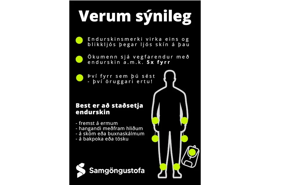 Staðreyndin er einföld: ökumenn eiga erfitt með að sjá gangandi vegfarendur í myrkri. Án endurskinsmerkis sést þú aðeins úr 20-30 metra fjarlægð. Með vottuðu endurskinsmerki sést þú úr 300 metra fjarlægð. Ökumaður á 60km/klst á blautum vegi þarf um 50 metra til að stöðva. Þá dugar einfaldlega ekki að sjást úr 20-30 metra fjarlægð.